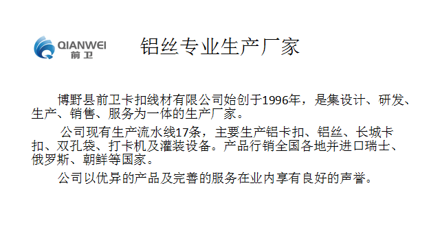 您現(xiàn)在所在的位置:卡扣廠家>新聞資訊>行業(yè)新聞>鋁絲用途廣泛